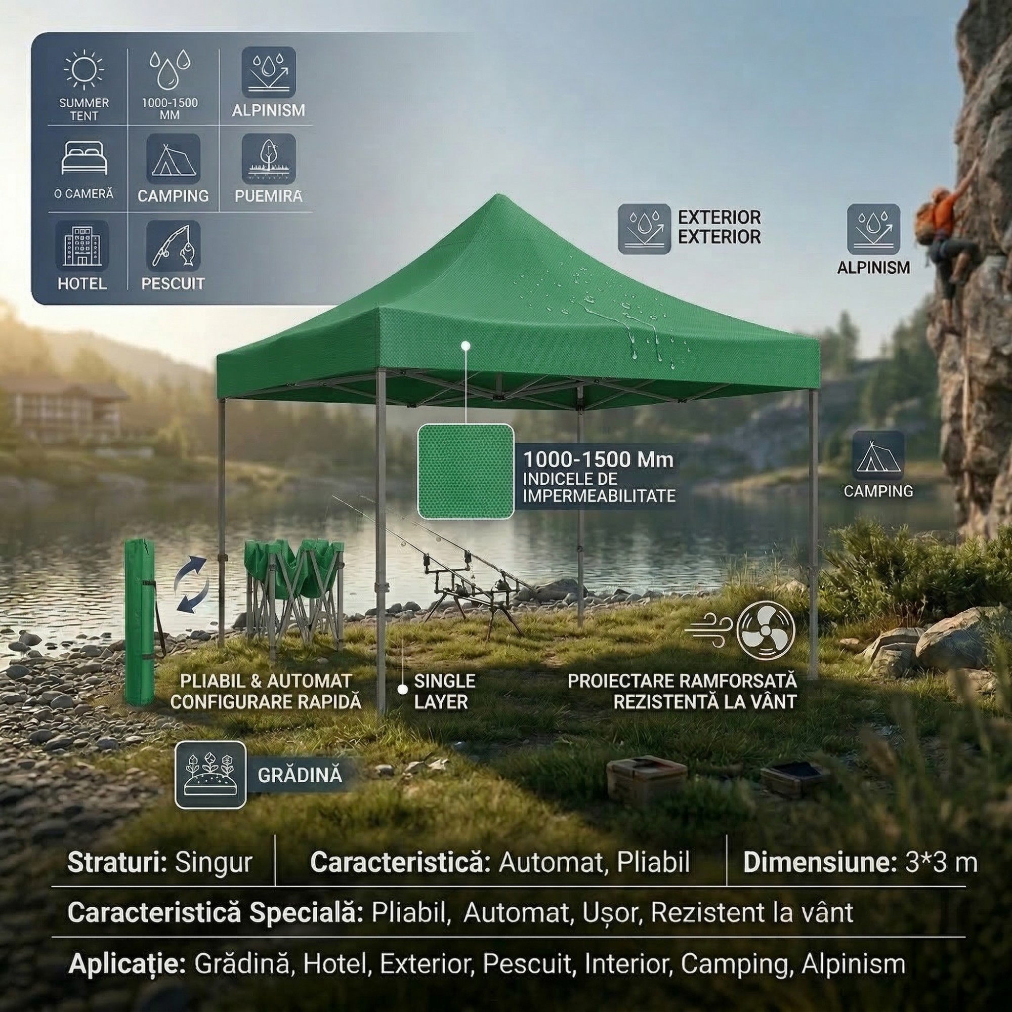 Cu o suprafata generoasa de 3x3 m, pavilionul este potrivit pentru mese in aer liber, petreceri in gradina, targuri, aniversari, catering, zone de relaxare sau activitati comerciale temporare. Materialul textil pe baza de nylon/poliester Oxford este gandit pentru utilizare sezoniera, iar structura tip single room permite organizarea eficienta a spatiului interior. Designul pliabil si functional il face usor de transportat, depozitat si repozitionat in functie de necesitate.