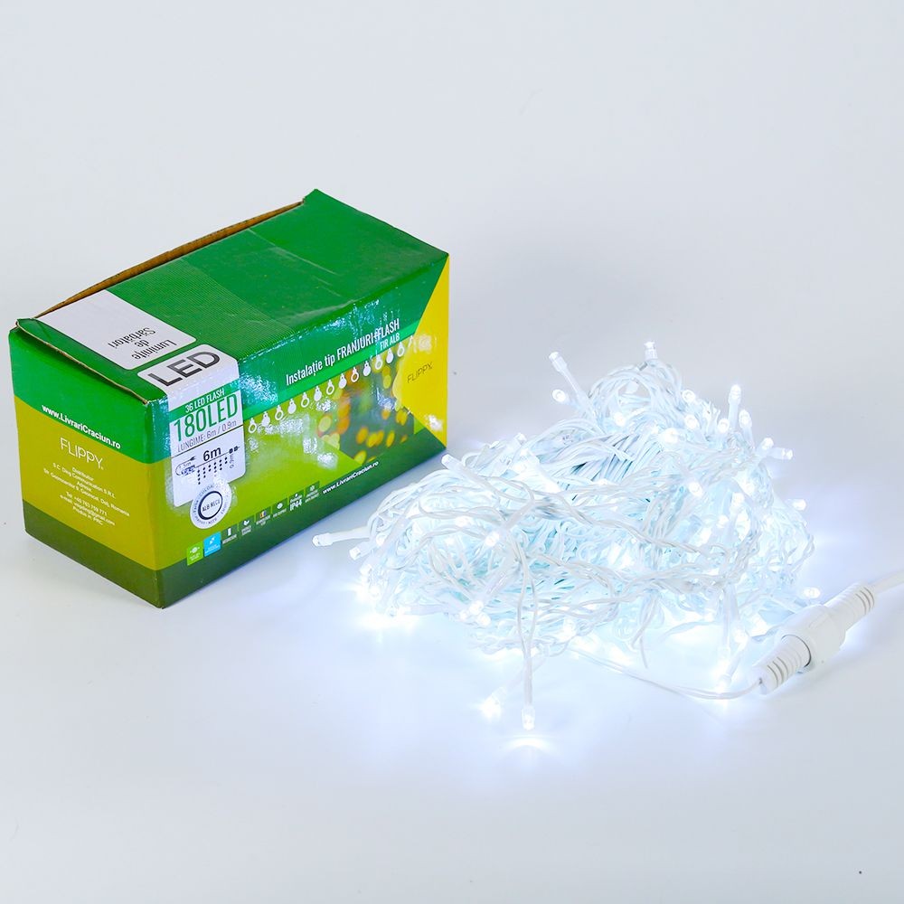 Instalatie de Craciun Flippy® Tip Franjuri cu Flash, 6 m, 180 LED-uri, Interconectabila, Alb Rece este interconectabila, lucru ce permite conectarea mai multor instalatii in limita a 3.000 de LED-uri.