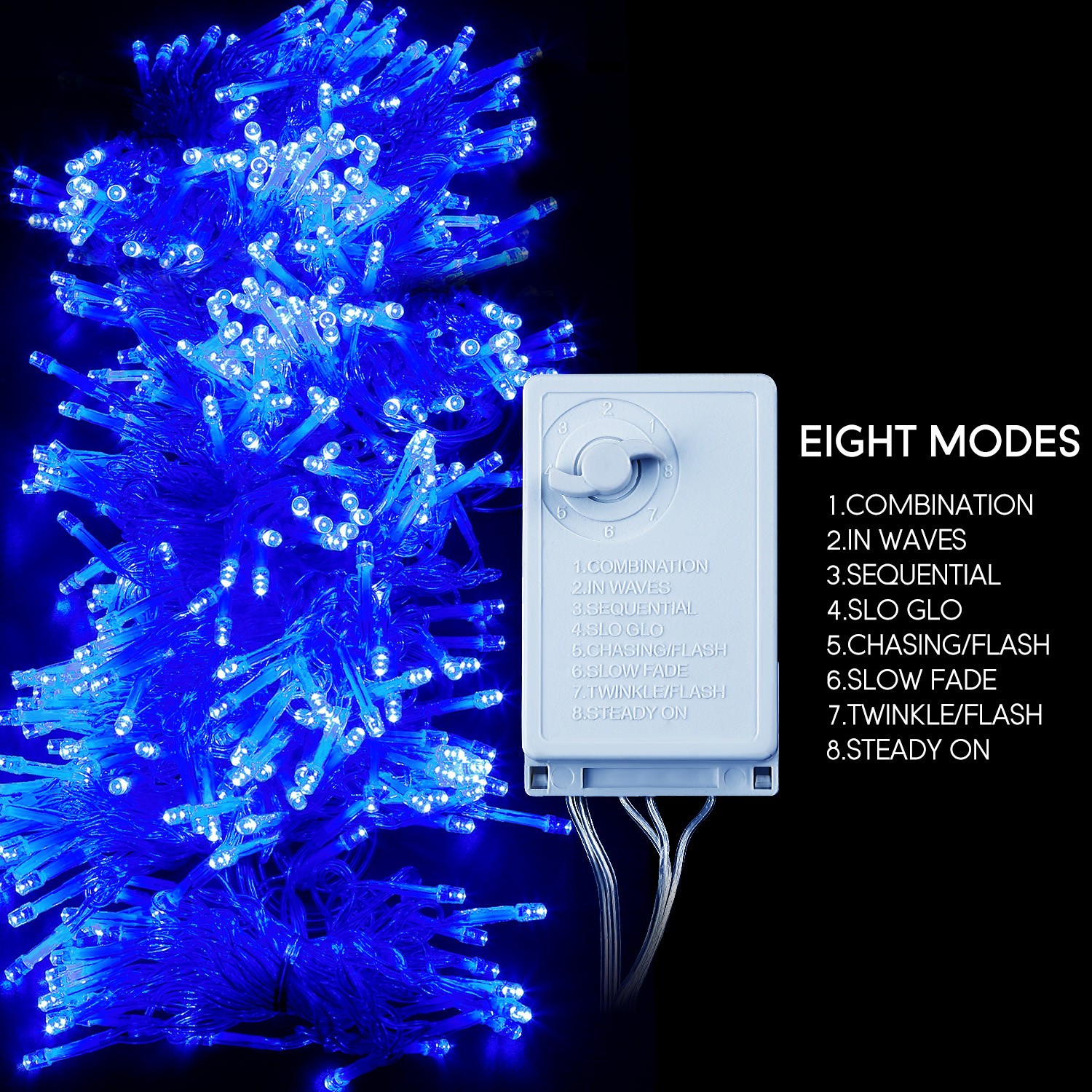Instalatia de Craciun Flippy® are 8 jocuri de lumini diferite ce pot fi schimbate din controller: combination, in waves, sequential, slow glow, chasing/ flash, slow fade, twinkle/ flash, steady on