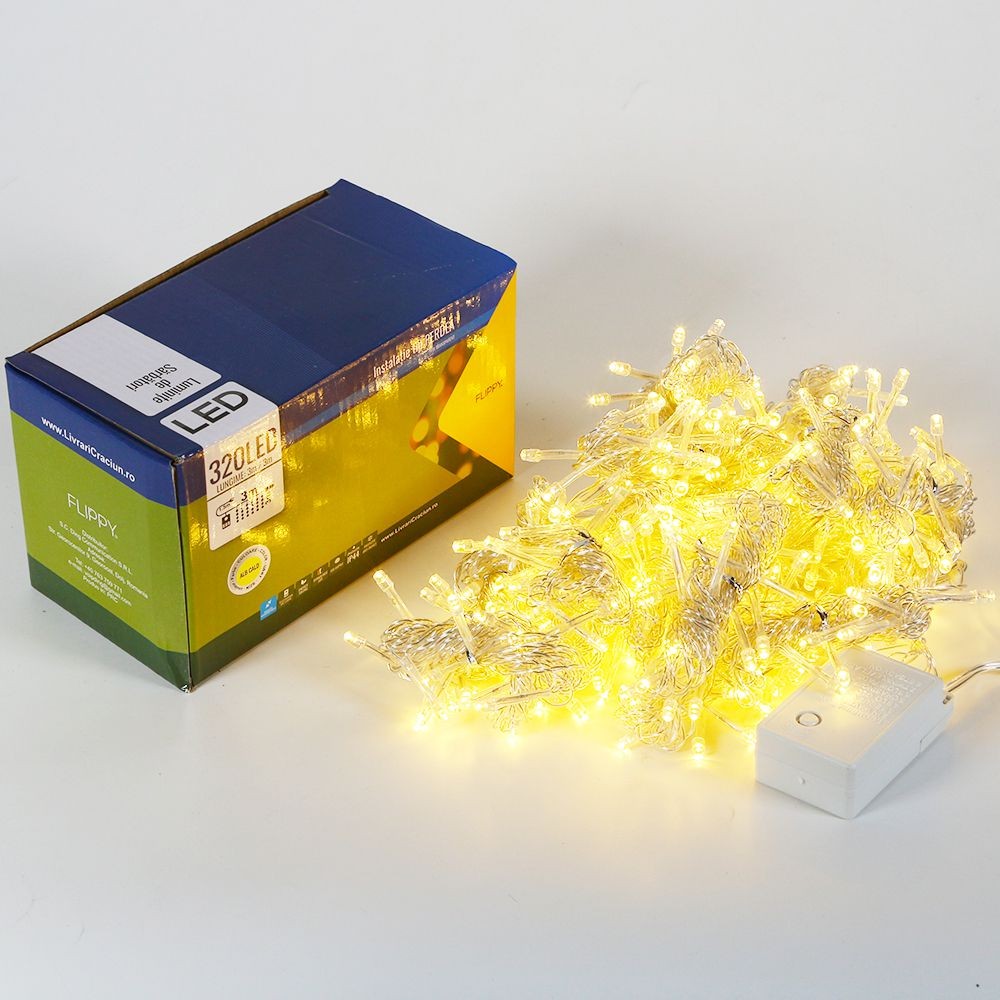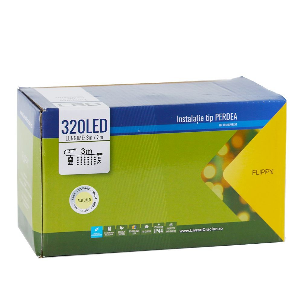 Instalatie de Craciun Flippy® Tip Perdea, 3 x 3 m, 320 LED-uri, Interconectabila, Alb Cald este interconectabila, lucru ce permite conectarea mai multor instalatii in limita a 3.000 de LED-uri.