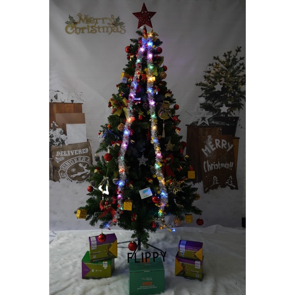 Set brad artificial de Craciun si elemente decorative, nins, decorat cu conuri pin, pentru interior/exterior, inaltime 210 cm, diametru 131 cm, 630 ramuri, Flippy, alb/verde, suport metalic inclus