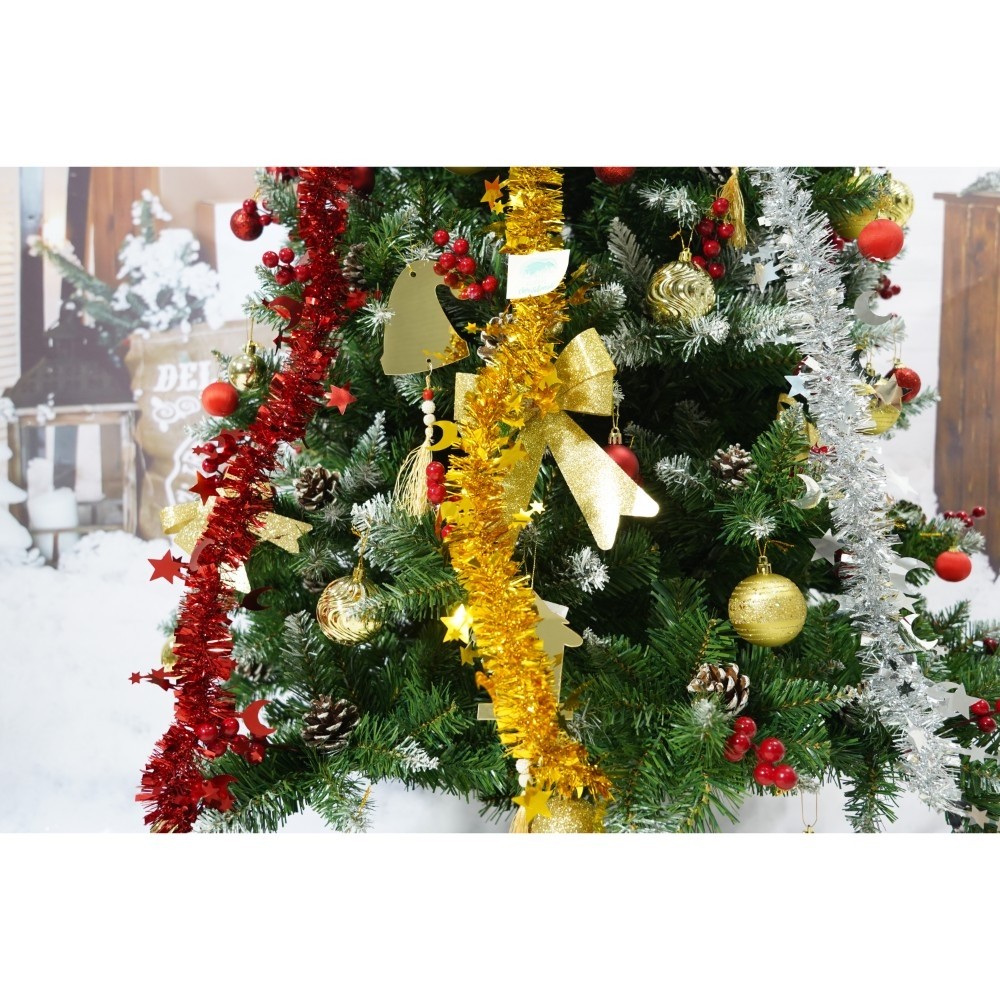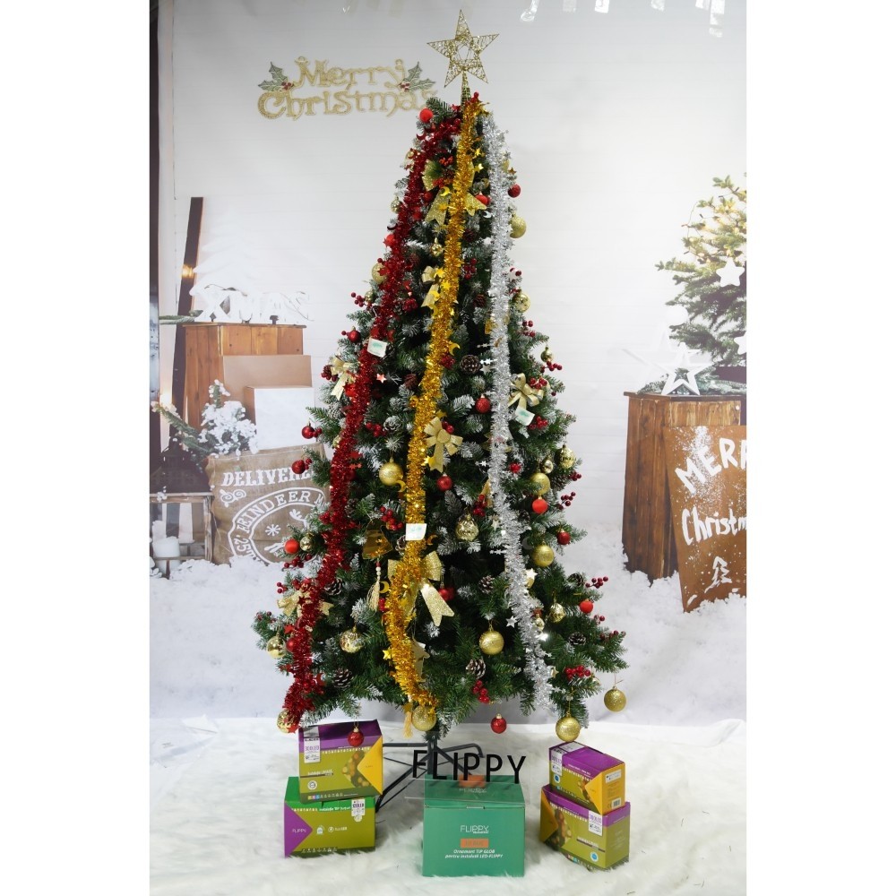 Set brad artificial de Craciun si elemente decorative, nins, decorat cu conuri pin rosii, inaltime 210 cm, diametru 106 cm, 643 ramuri, Flippy, verde, suport metalic inclus