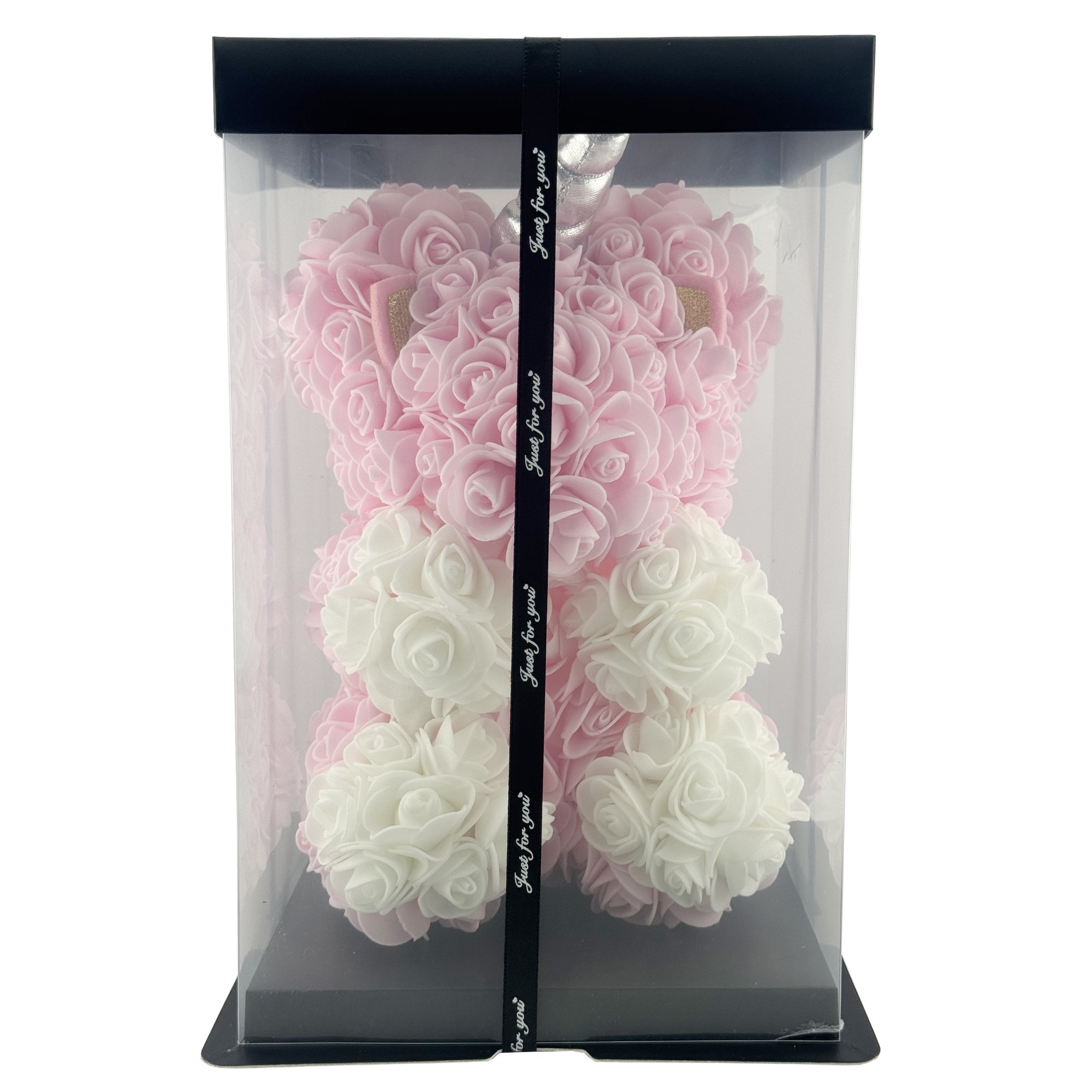 Trandafirii din spuma sunt rezistenti si isi mentin forma si culoarea in timp, fara intretinere speciala. Unicornul este livrat intr-o cutie transparenta eleganta, care il protejeaza si il face ideal pentru a fi oferit direct cadou.