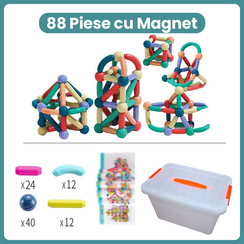 Piesele sunt realizate din materiale rezistente si sigure pentru copii, avand magneti integrati care asigura o fixare stabila. Copiii pot crea constructii variate, precum turnuri, casute, forme geometrice sau structuri abstracte, dezvoltandu-si coordonarea mana–ochi si creativitatea.