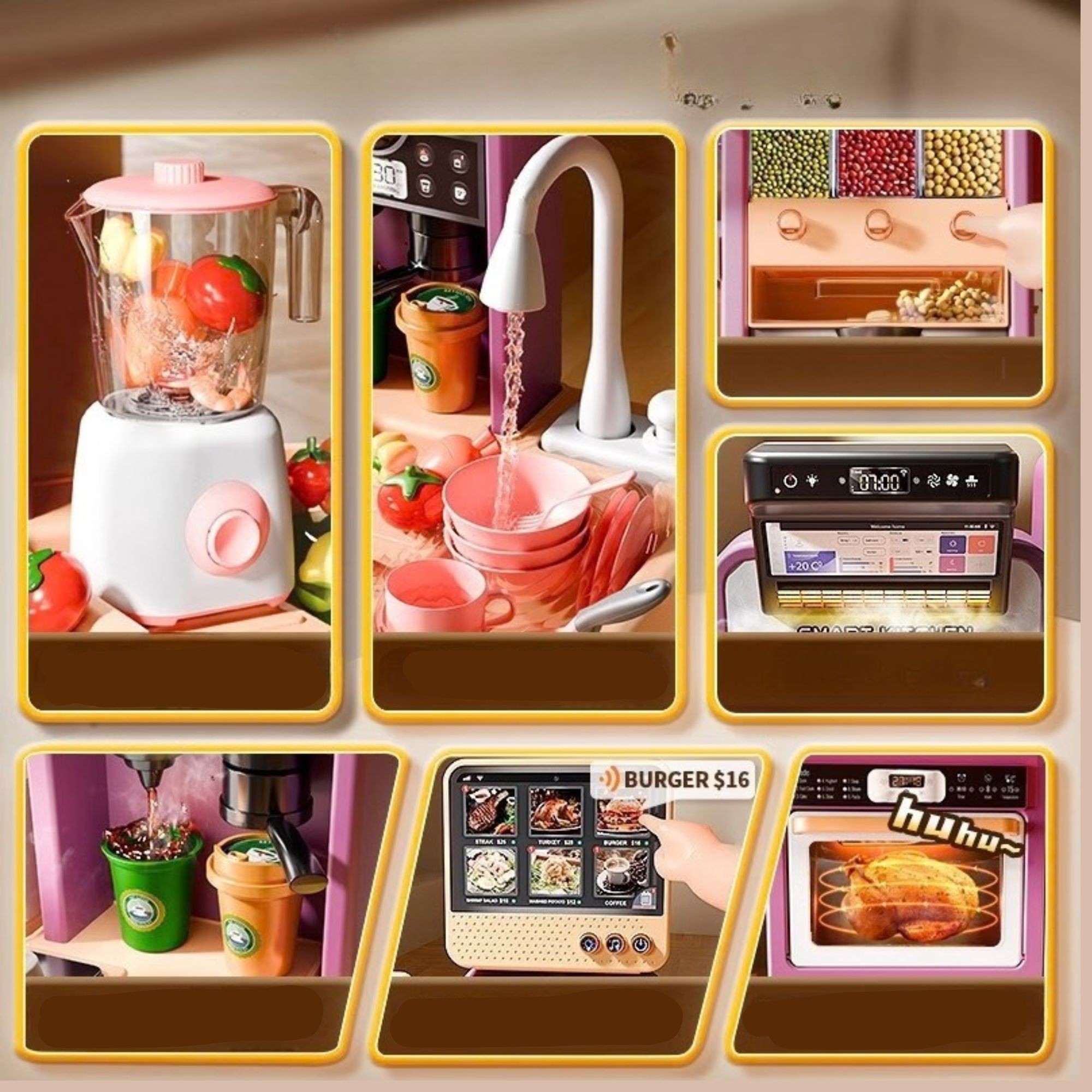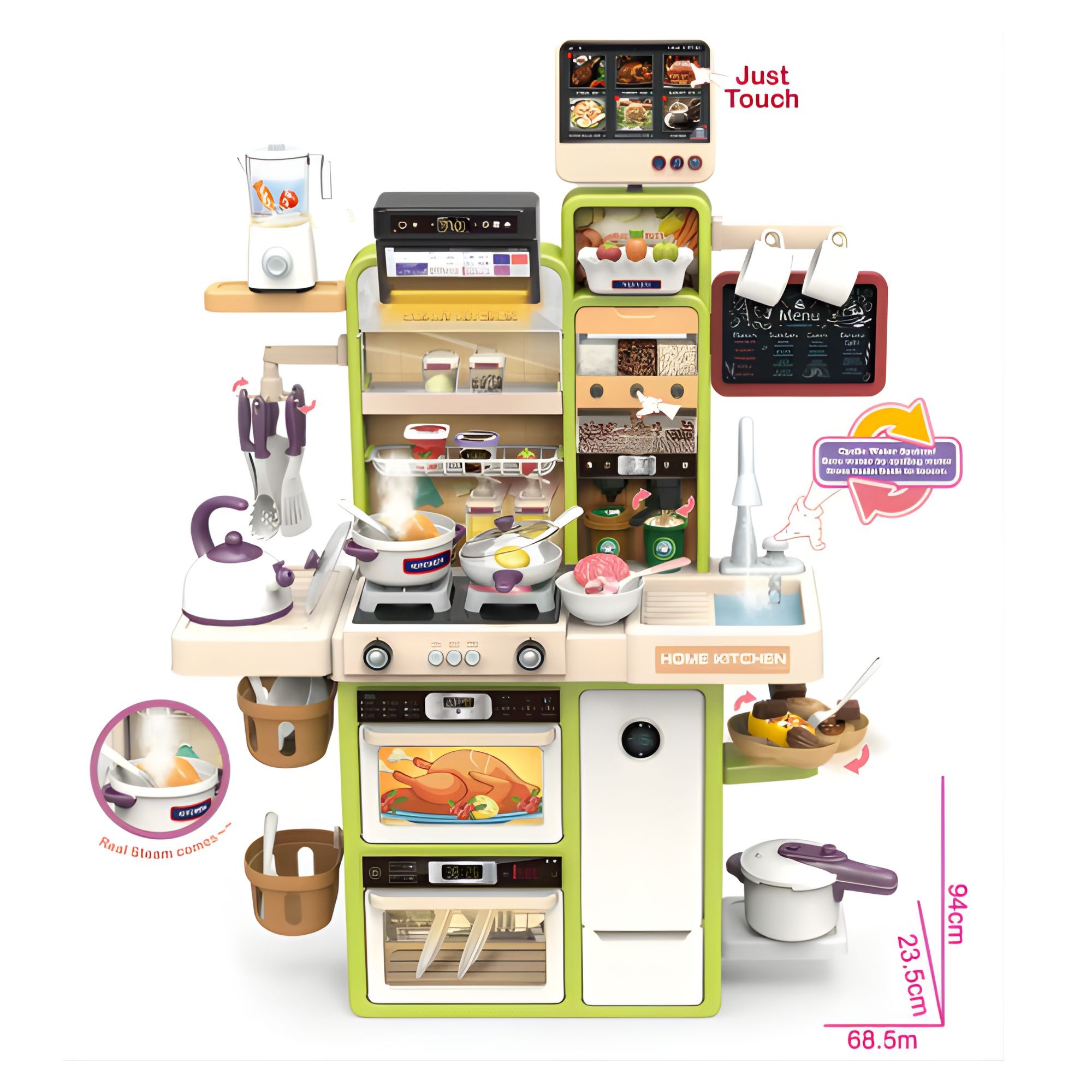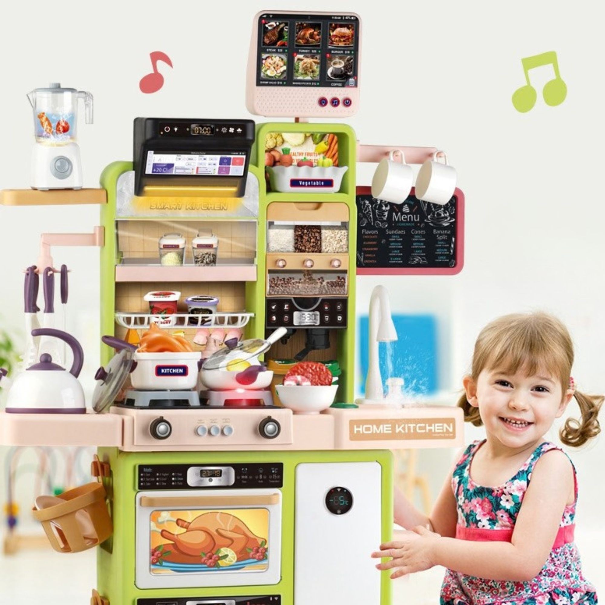 Bucatarie pentru Copii, Flippy, Jucarie Montessori, din Plastic Rezistent, Set de Joaca Educativ cu Electrocasnice, Ustensile, Alimente, Accesorii pentru Gatit, 68 x 23 x 93 cm, Alb/Verde