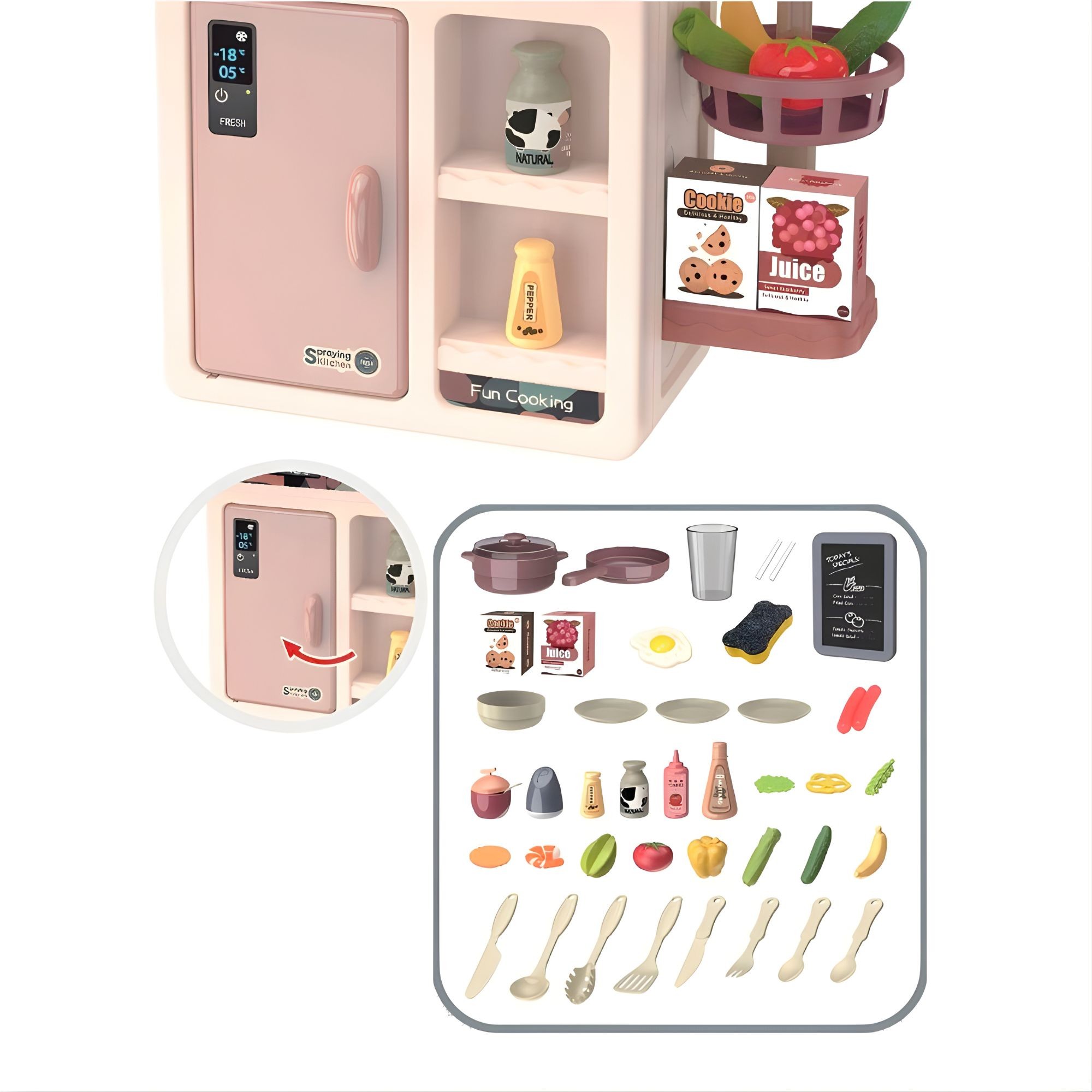 Bucataria vine cu 42 de accesorii, inclusiv ustensile, alimente de jucarie, fructe si legume, oferind tot ce este necesar pentru a crea diferite scenarii de gatit si servire a mesei.