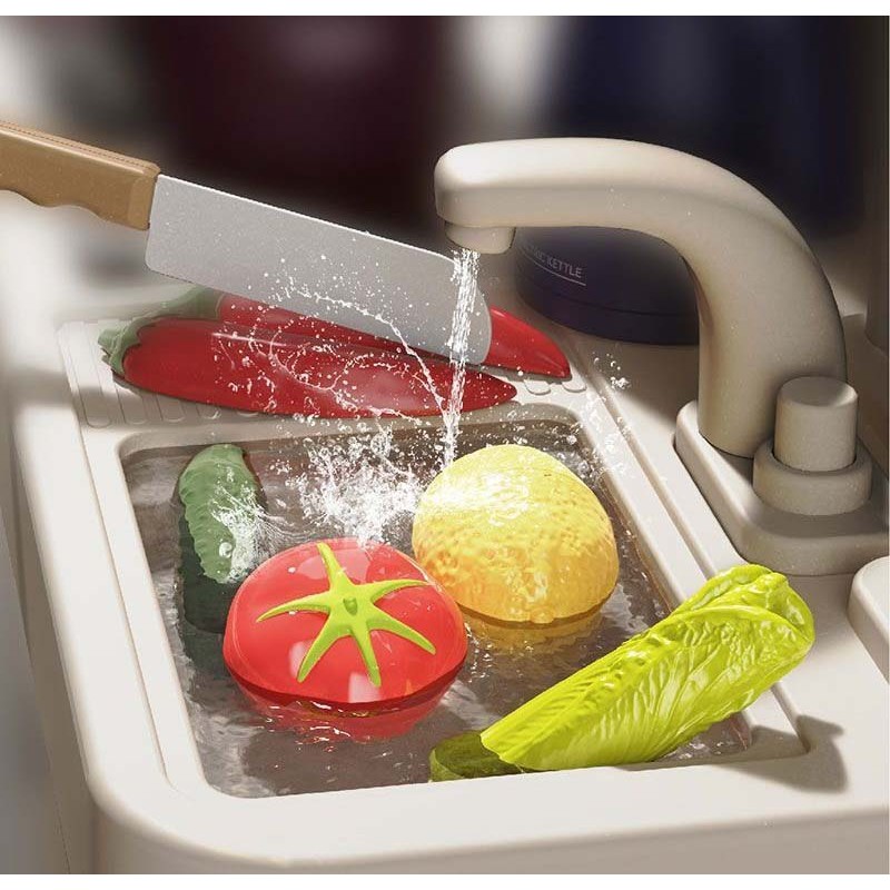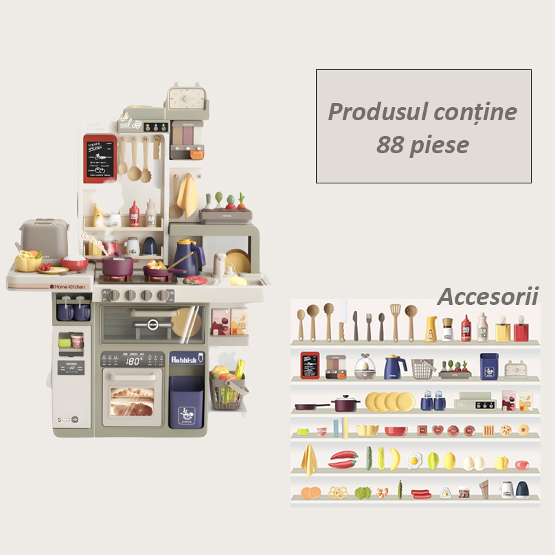 Setul include o multime de elemente interactive precum aragaz cu efect de abur, chiuveta cu flux real a apei, hota cu muzica si lumini, precum si numeroase ustensile si alimente de jucarie. Designul colorat si detaliile realiste ii ajuta pe copii sa inteleaga mai bine activitatile din bucatarie si sa dezvolte jocuri de rol creative.