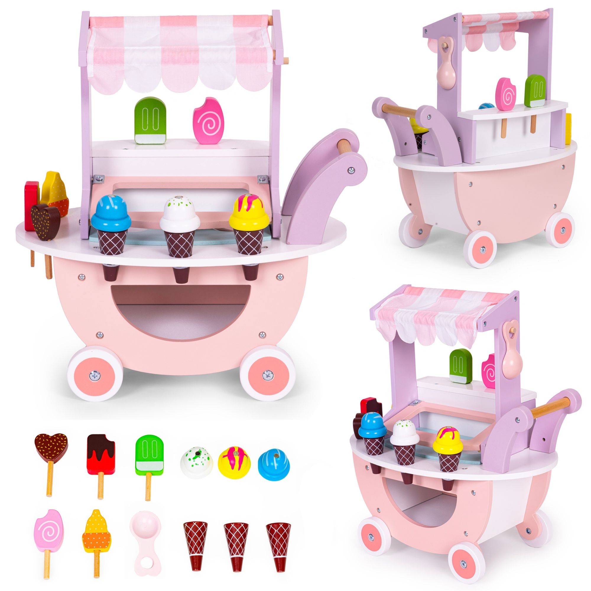 Carucior cu Inghetata pentru Copii, Flippy, din Lemn, Magnetic, Joc de Rol Montessori, cu Depozitare si Roti, 41x19x44 cm, Roz