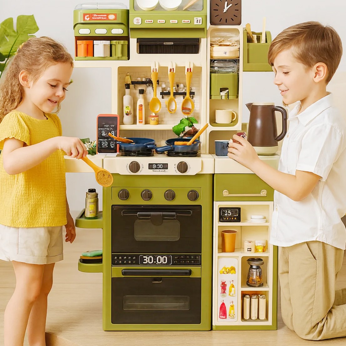 Cu un design modern si realist, bucataria include plita, cuptor, chiuveta, frigider, aparat de cafea si multiple spatii de depozitare, astfel incat cei mici sa poata recrea experiente reale din bucatarie. Efectele de lumina si sunet fac joaca si mai captivanta.