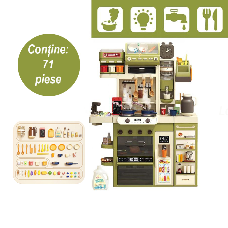 Setul contine 71 de piese, precum vase, ustensile, alimente de jucarie si diverse accesorii de bucatarie, oferind copiilor tot ce au nevoie pentru ore intregi de distractie.