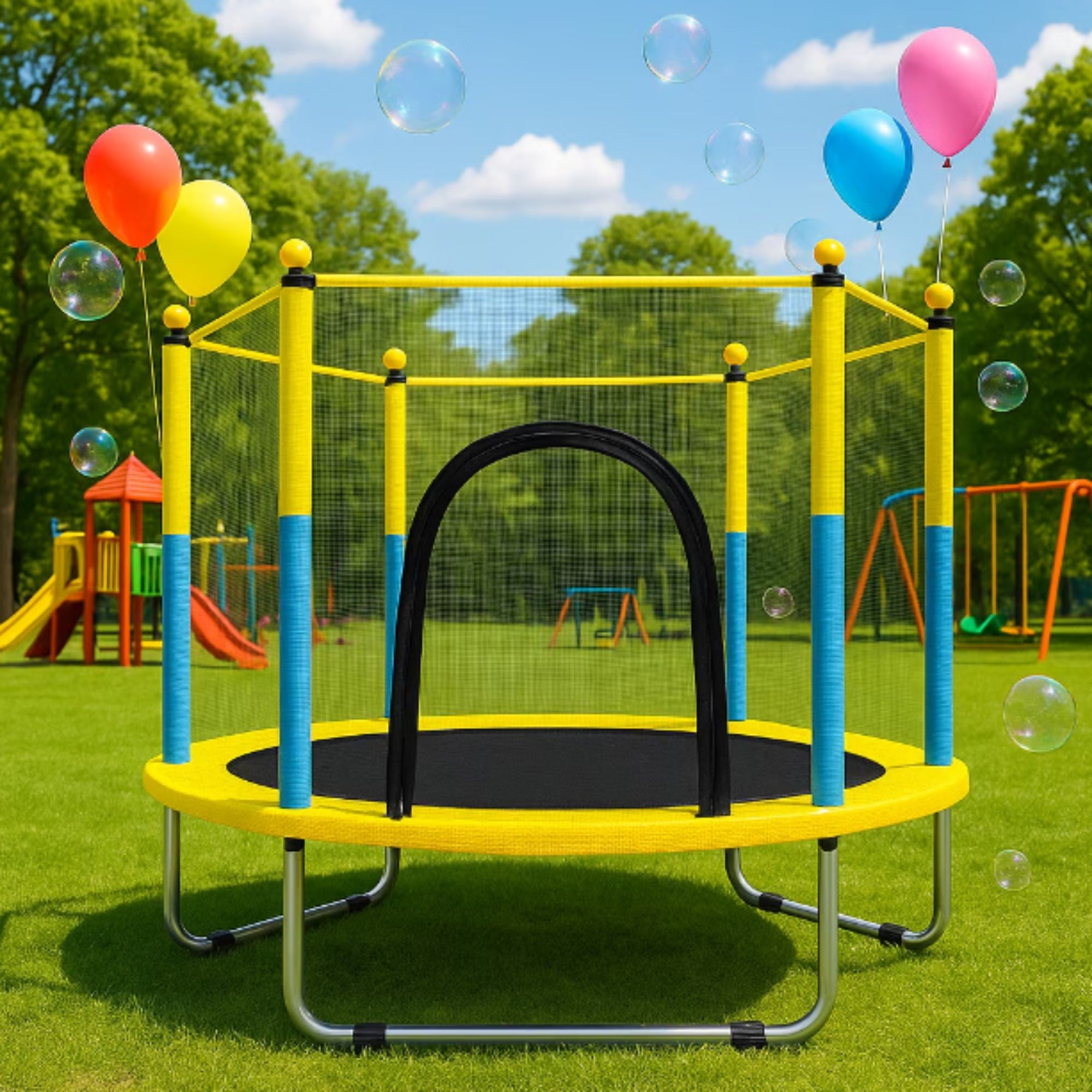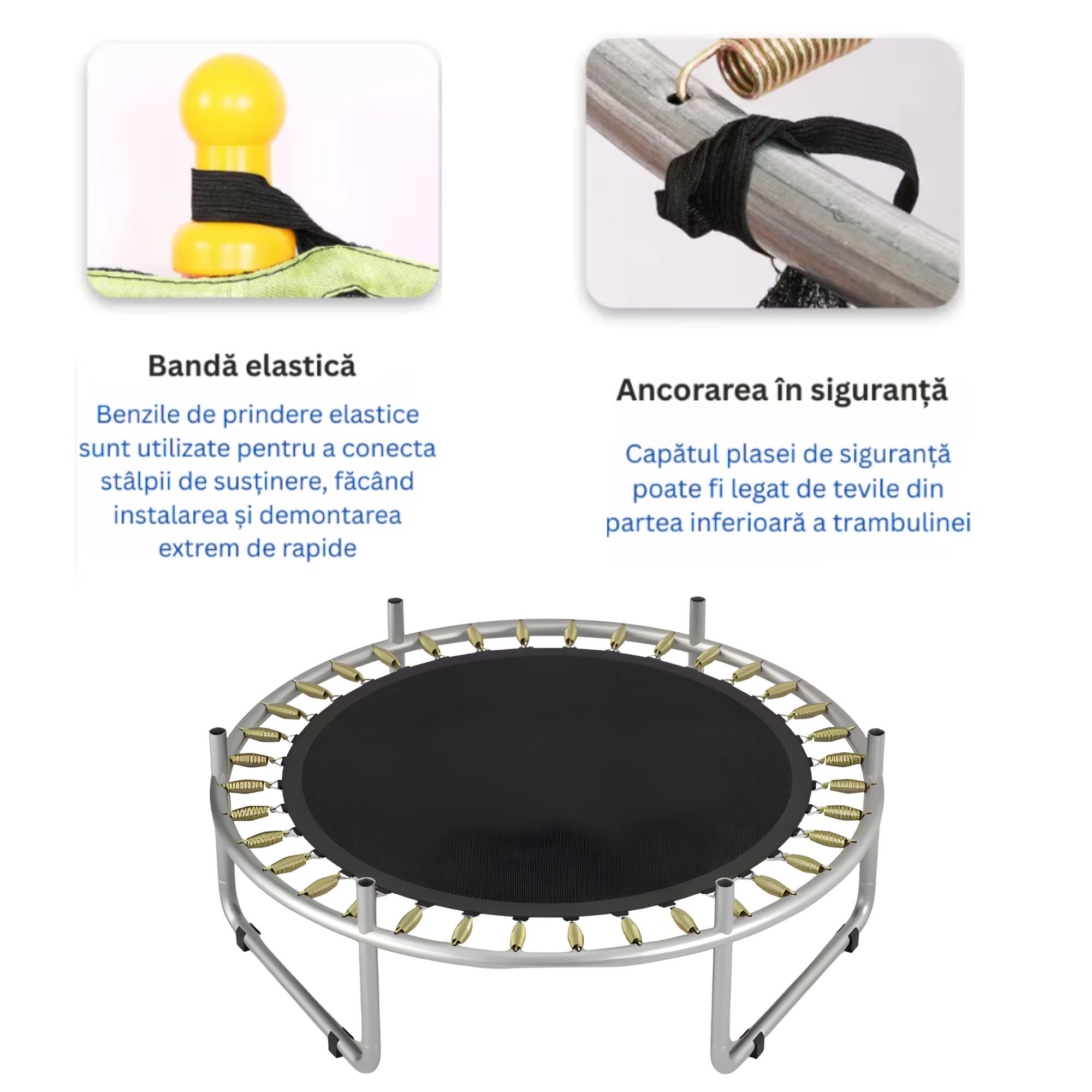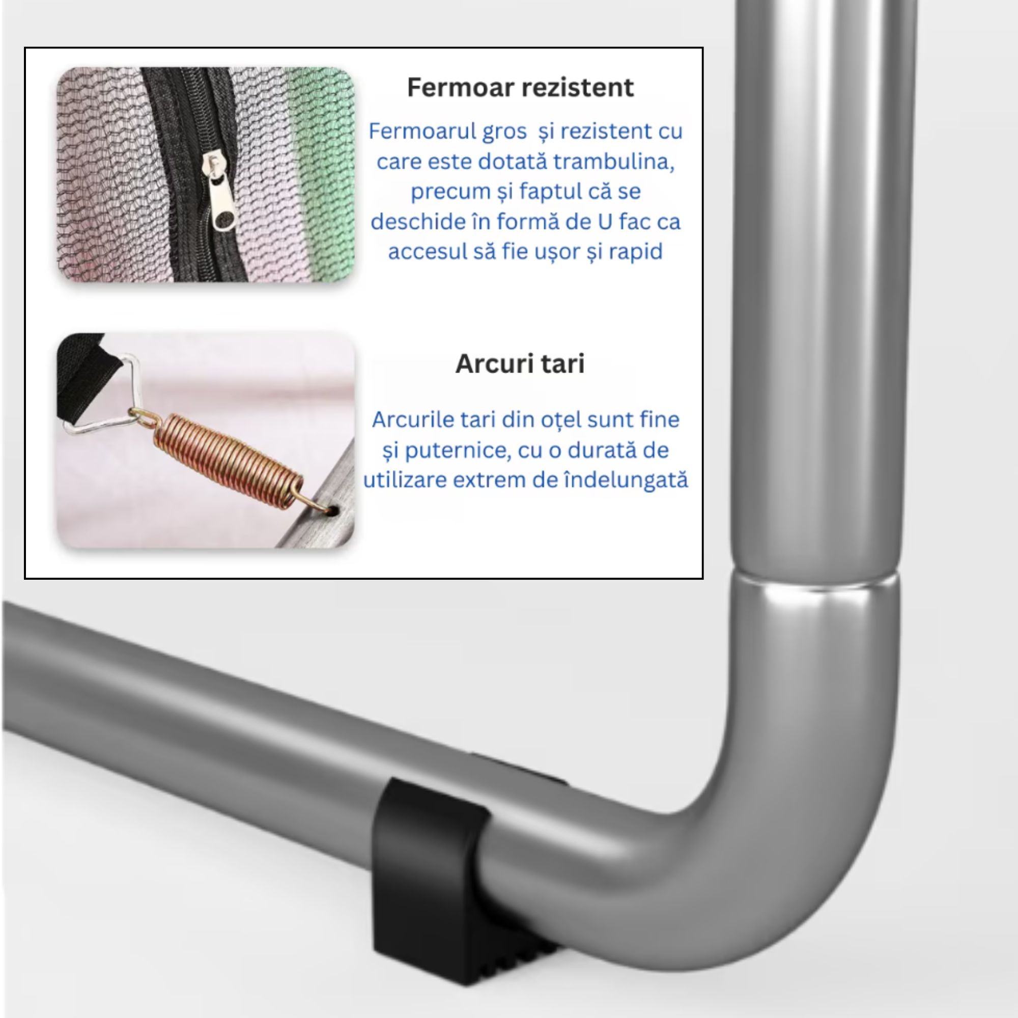 Prevazuta cu plasa de protectie rezistenta si sistem de inchidere cu fermoar, trambulina asigura un nivel ridicat de siguranta in timpul utilizarii, prevenind caderea accidentala in timpul sariturilor. Structura metalica stabila si materialele durabile sunt concepute pentru a rezista utilizarii frecvente si pentru a oferi stabilitate optima.