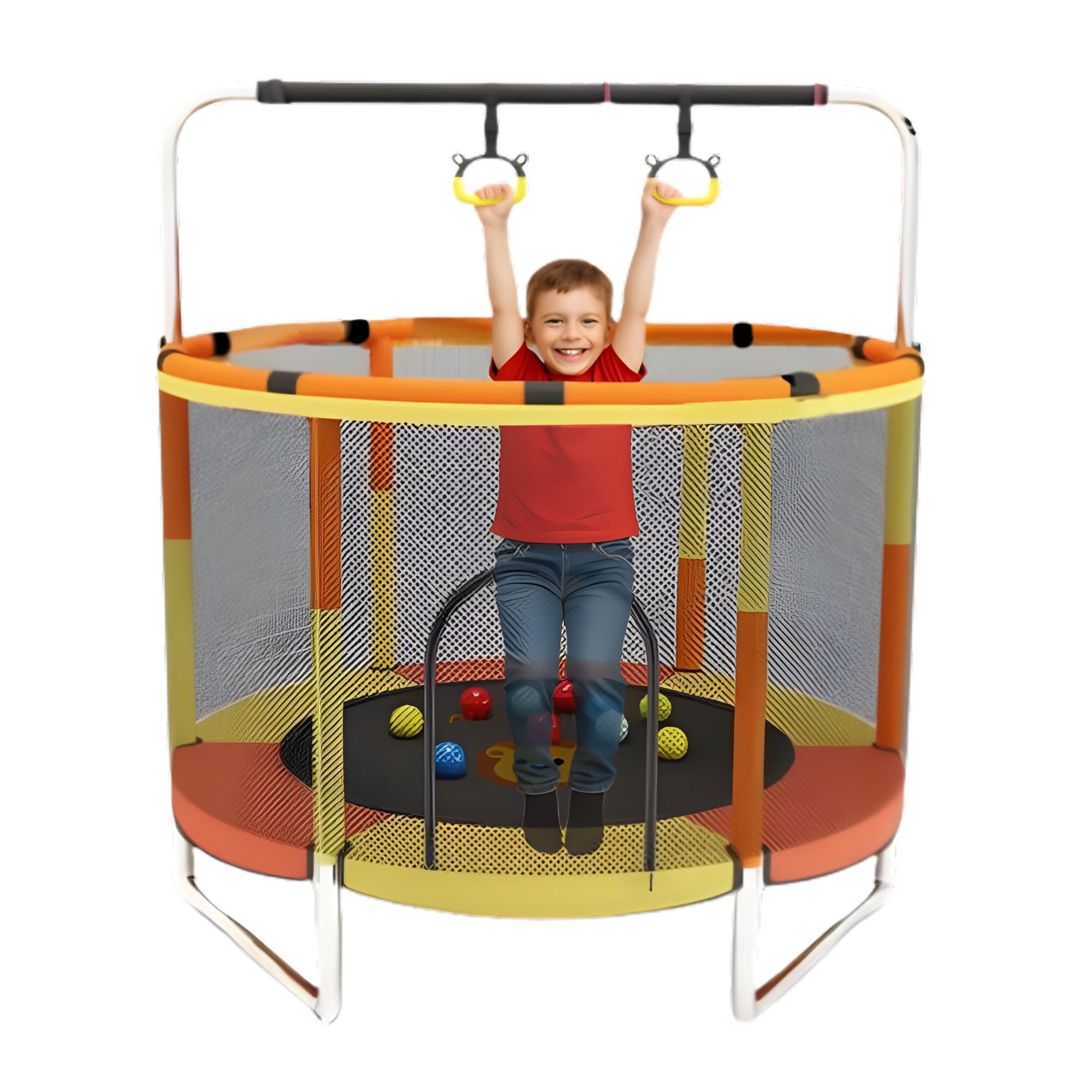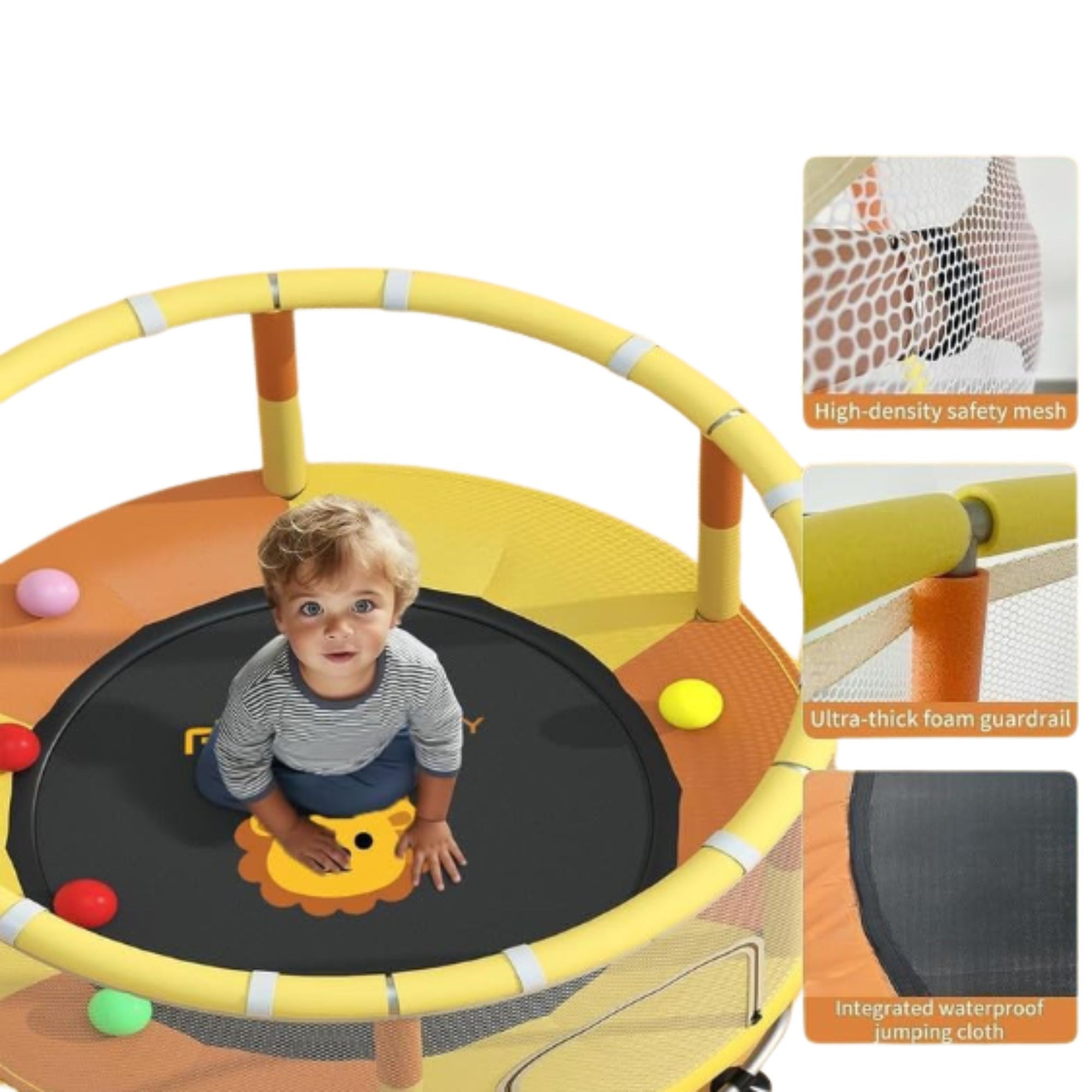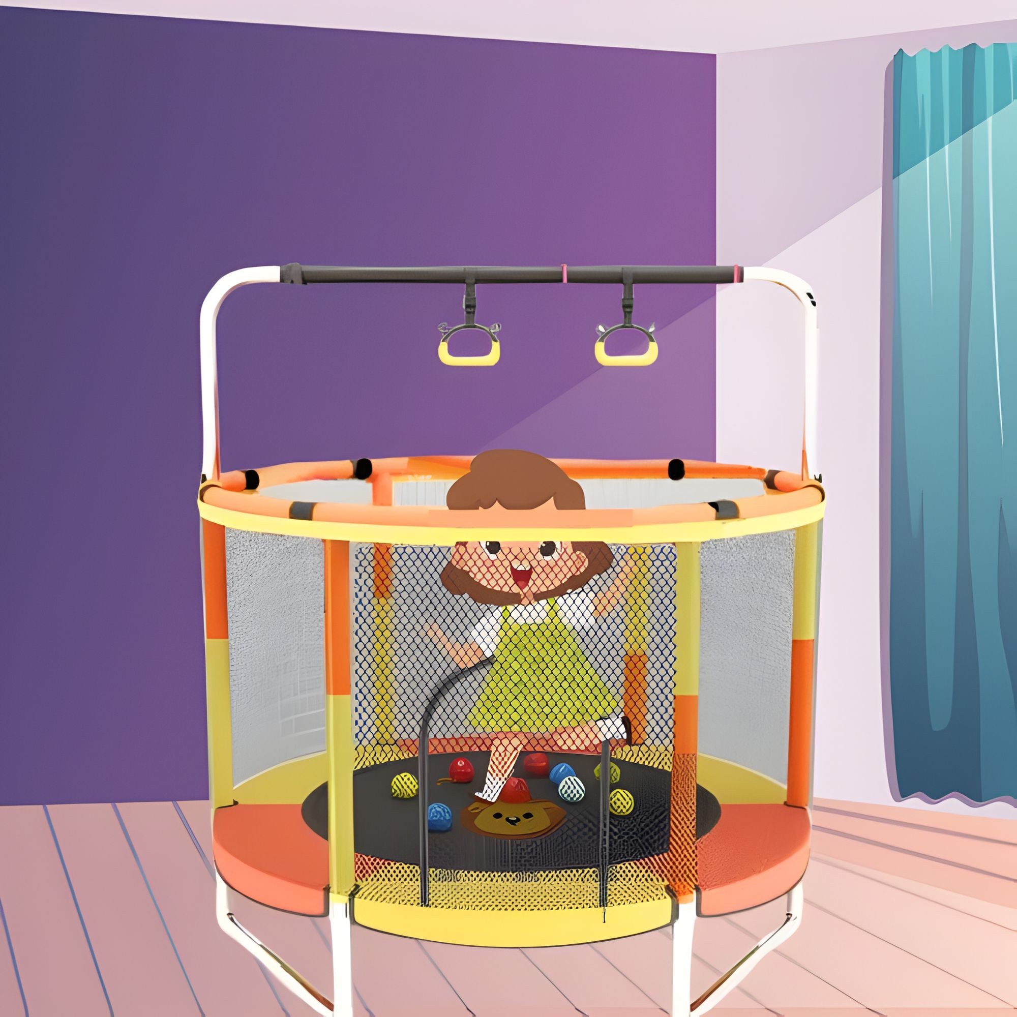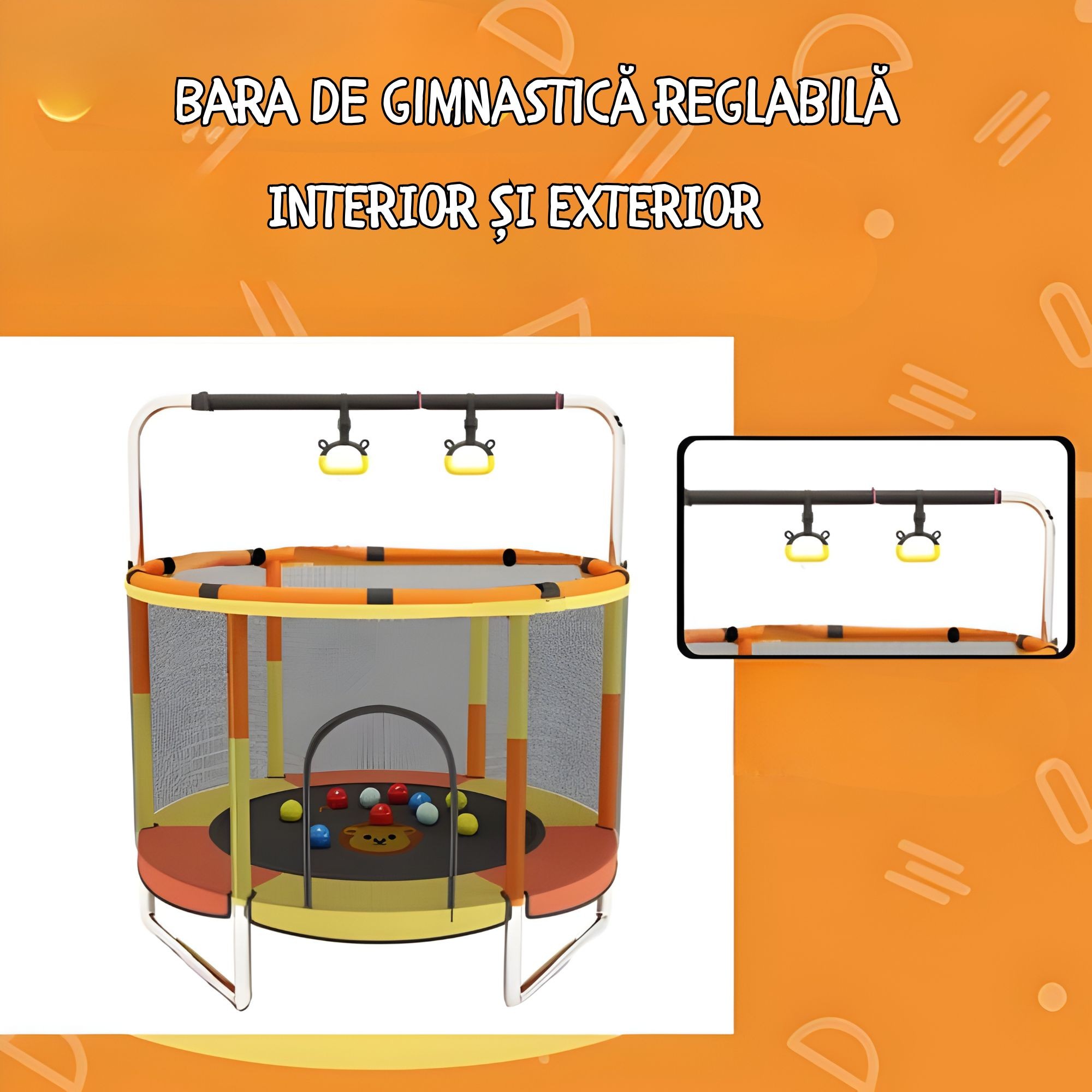 Trambulina este prevazuta cu bara de gimnastica pentru sustinere, care ajuta copiii sa isi mentina echilibrul in timpul sariturilor. Aceasta ofera un plus de siguranta si poate fi utilizata pentru exercitii simple de coordonare.