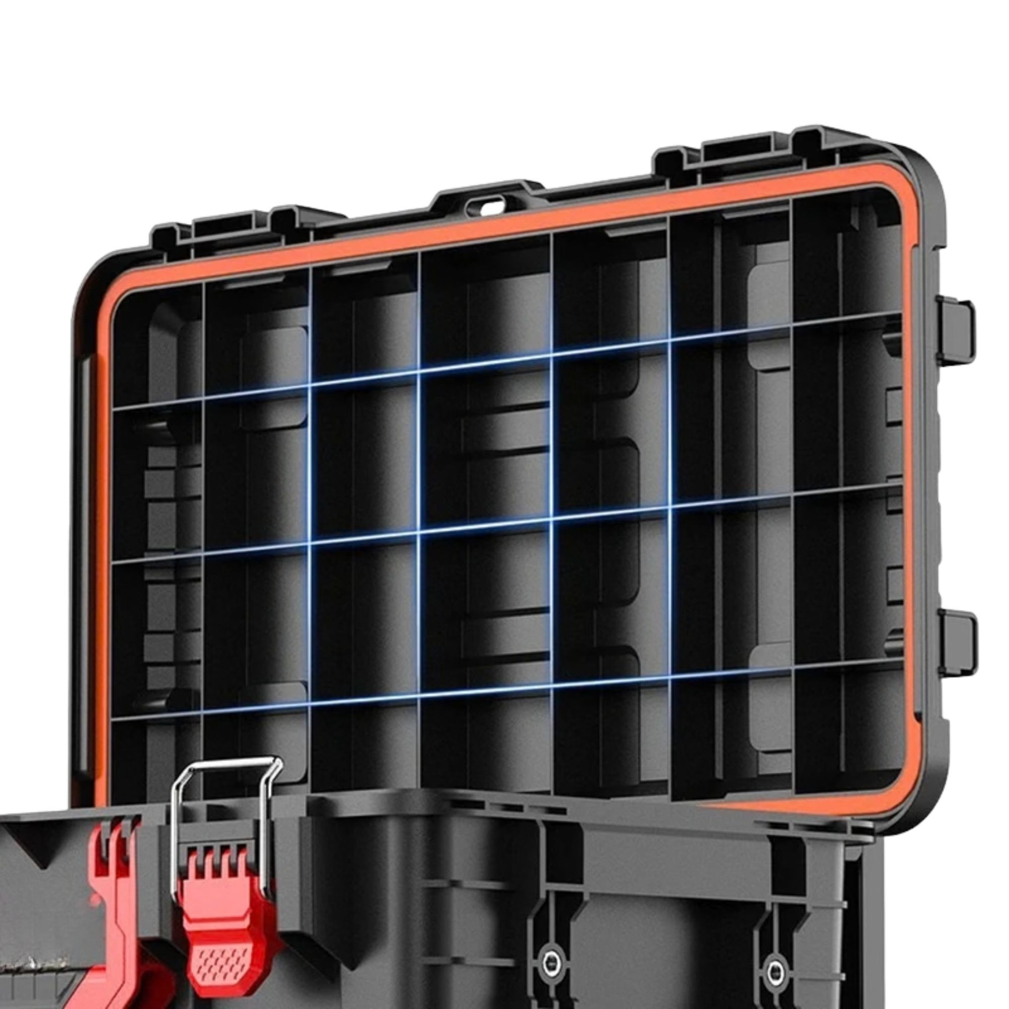 Carcasa robusta este proiectata pentru utilizare intensa, iar protectia IP65 ajuta la pastrarea continutului in siguranta impotriva prafului si stropilor de apa. Este ideala pentru depozitare in atelier, service, depozit sau portbagaj, oferind acces rapid la unelte si o organizare clara pe niveluri.