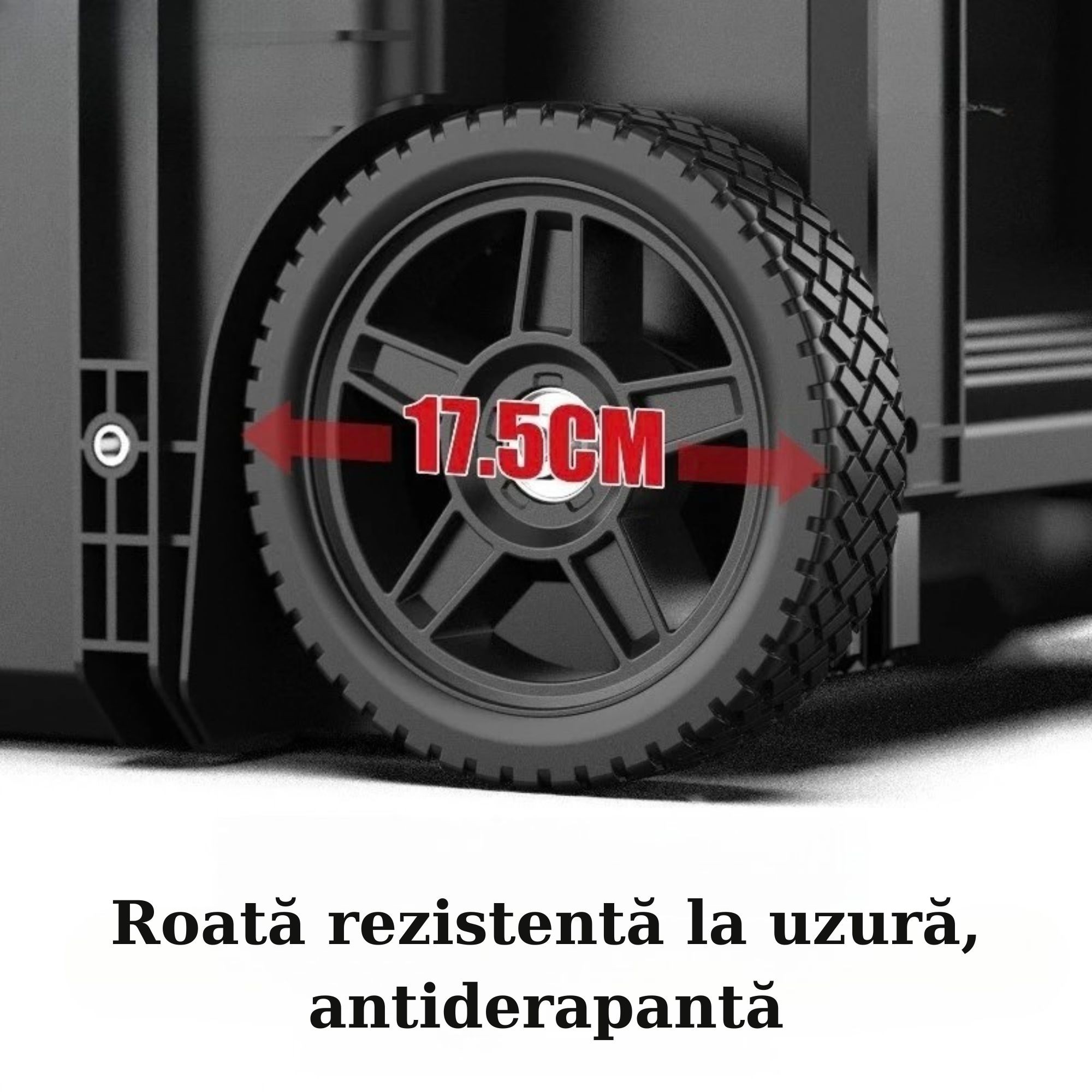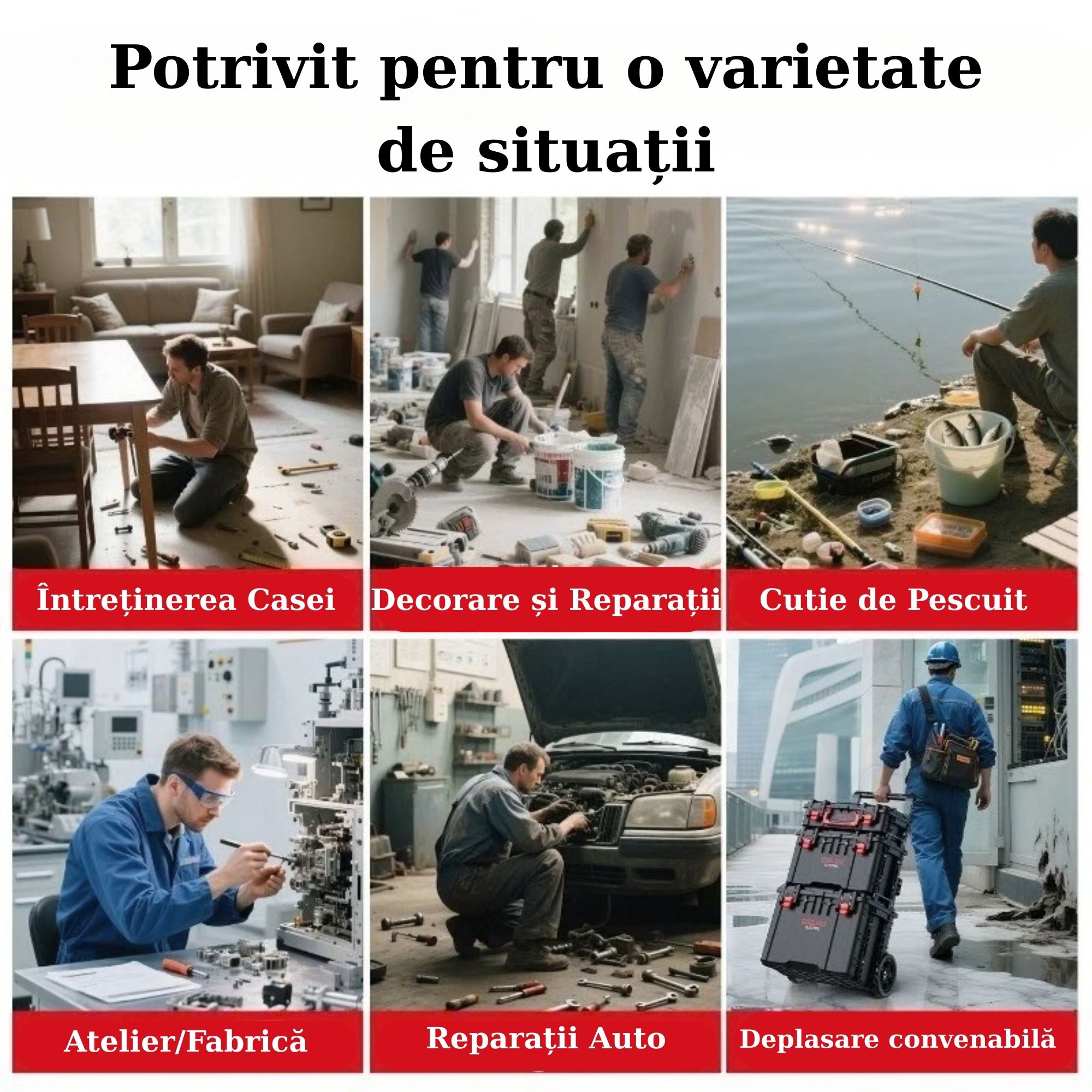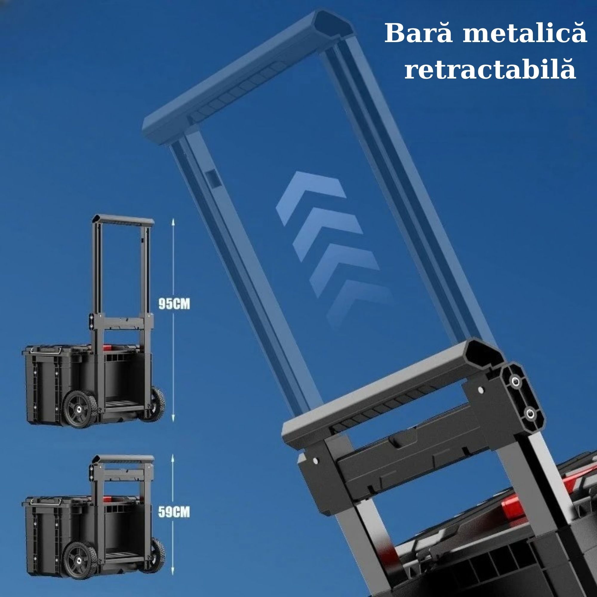 Cutiile se stivuiesc si se blocheaza sigur intre ele, astfel incat sa le poti muta ca un singur ansamblu, fara balans sau desprindere. Datorita manerului telescopic metalic si rotilor mari, transportul pe santier, in garaj sau intre masini devine mult mai comod, chiar si atunci cand setul este incarcat.