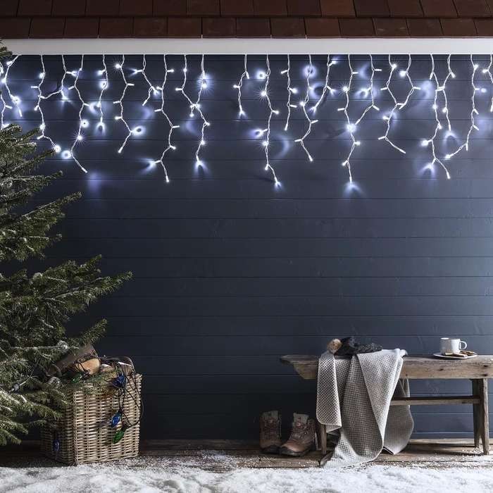 Instalatie de Craciun Premium Flippy® Tip Franjuri, Flash, cu transformator, 25 m, 600 LED-uri, Interconectabila, Fir Alb, Alb Rece