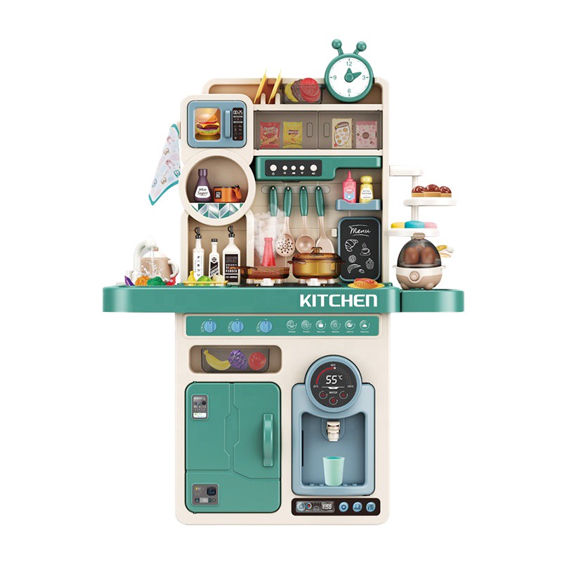Bucatarie Multifunctionala pentru Copii, Flippy, cu Lumini si Sunete Realiste, Aburi, Robinet cu Flux de Apa, 93 Piese, 96 x 71 x 28 cm, 3 Ani+, Multicolor, Verde/Crem