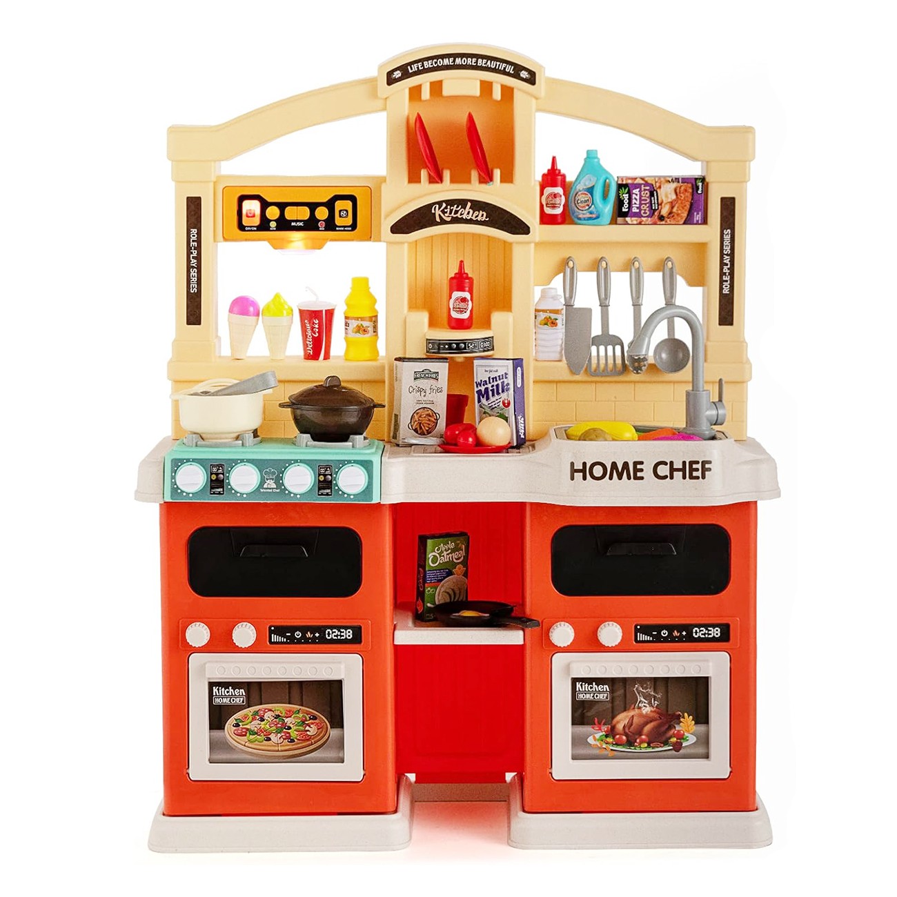 Bucatarie Multifunctionala pentru Copii Modern Kitchen Home Chef, Flippy, cu Lumini si Sunete Realiste, Aburi, Robinet cu Circuit de Apa, Efect Fierbere, 77 Piese, 83 x 66 x 24 cm, 3 Ani+, Portocaliu