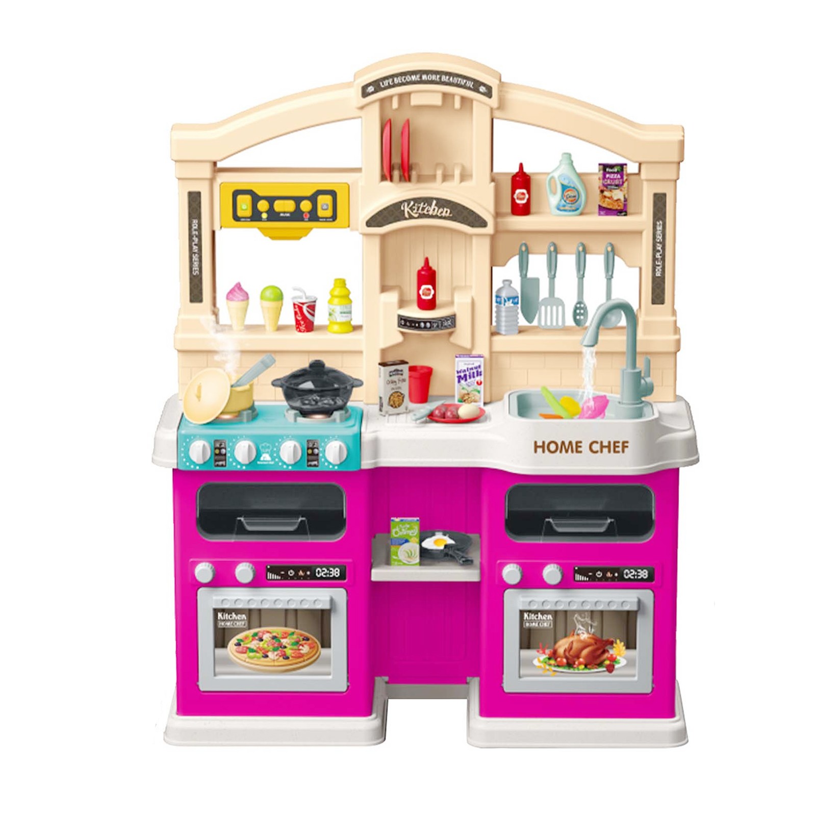 Bucatarie Multifunctionala pentru Copii Modern Kitchen Home Chef, Flippy, cu Lumini si Sunete Realiste, Aburi, Robinet cu Circuit de Apa, Efect Fierbere, 77 Accesorii Incluse, 83 x 66 x 24 cm, 3 Ani+, Roz