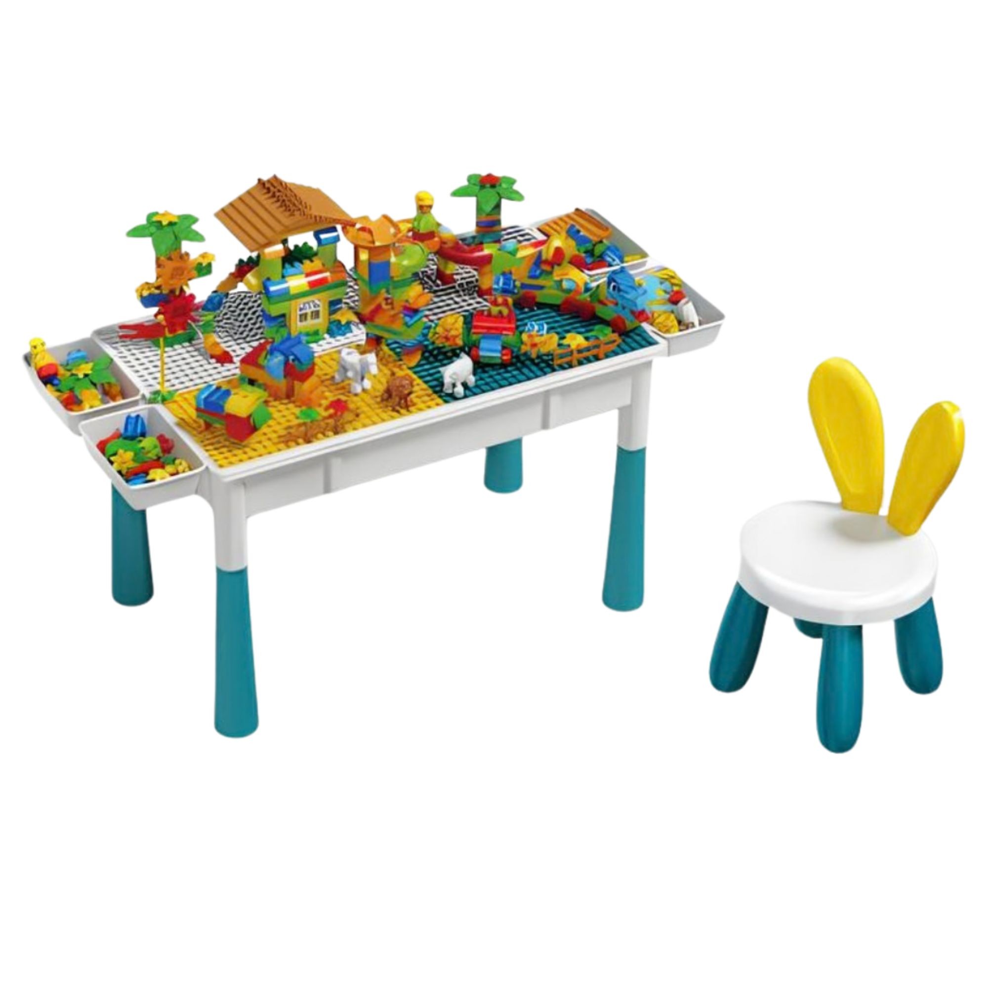 Masuta Multifunctionala, Flippy, Educativa pentru Copii, Scaunel Bunny, Blat Reversibil, Compatibila cu Piese mari tip LEGO Duplo, 4 cutii depozitare, Set 156 piese, 3+Ani, Multicolor
