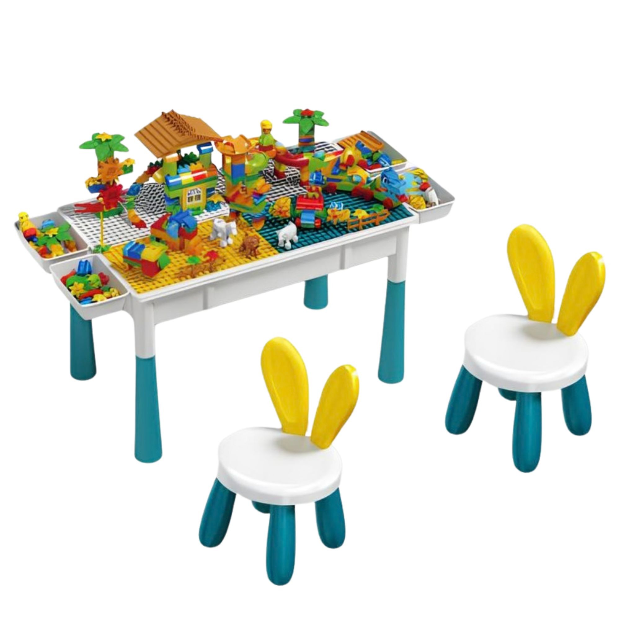 Masuta Multifunctionala, Flippy, Educativa pentru Copii, Scaunel Bunny 2 unitati, Blat Reversibil, Compatibila cu Piese mari tip LEGO Duplo, 4 cutii depozitare, 156 piese, 3+Ani, Multicolor