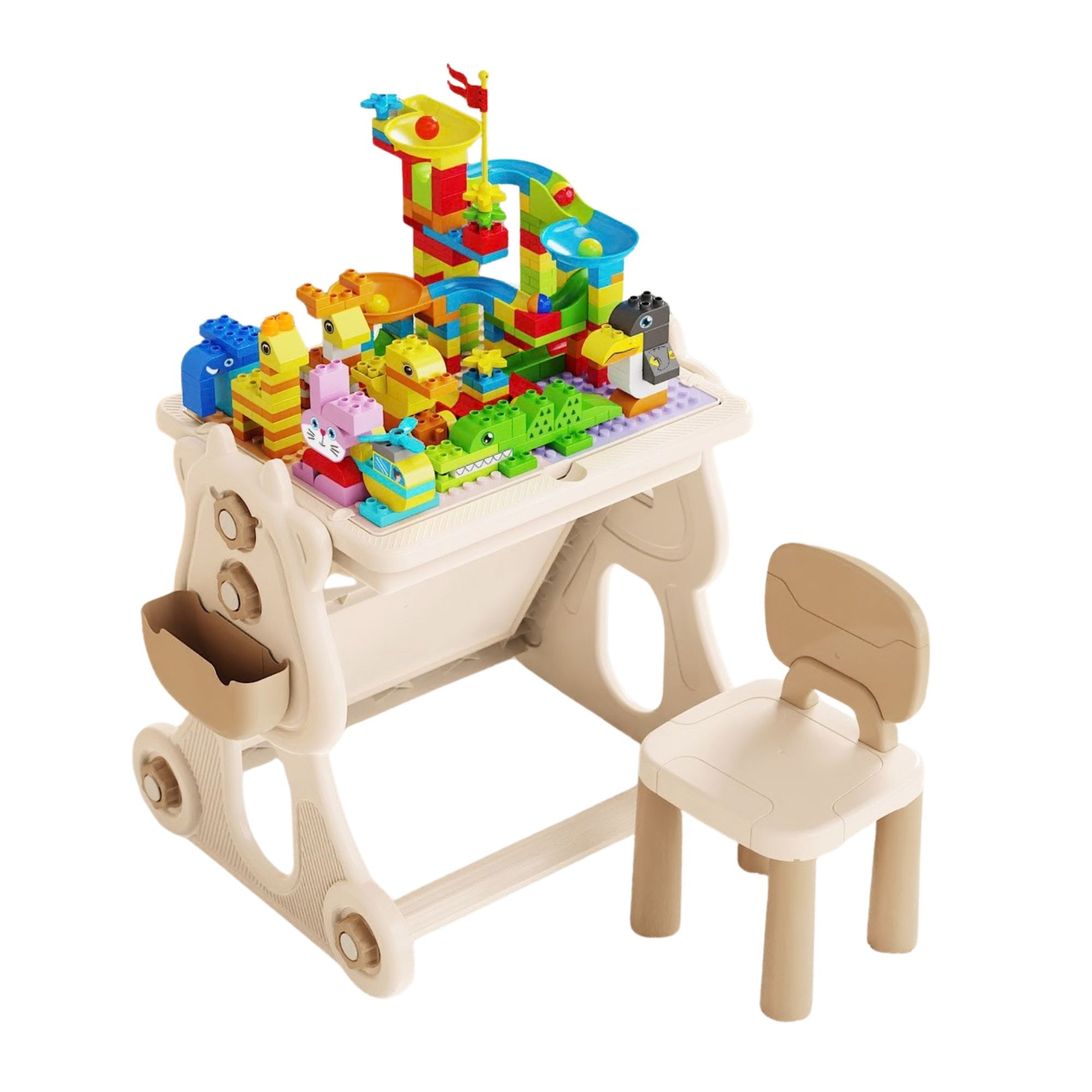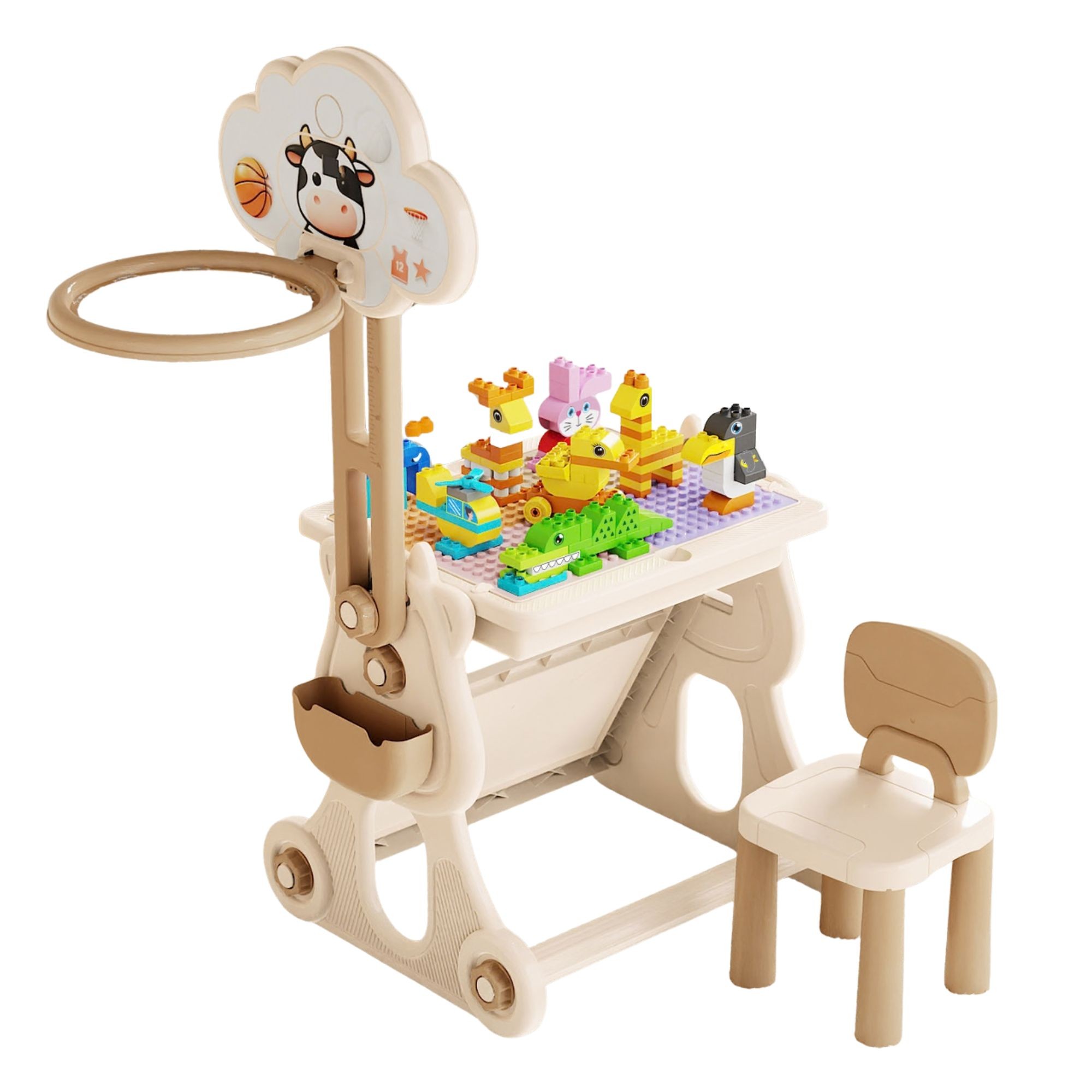 Masa Educativa pentru Copii, Flippy, Multifunctionala, Cos de Baschet, cu Scaun, Compatibila cu Piese tip LEGO Duplo, 178 piese, Spatiu Depozitare, 3 + ani, Bej